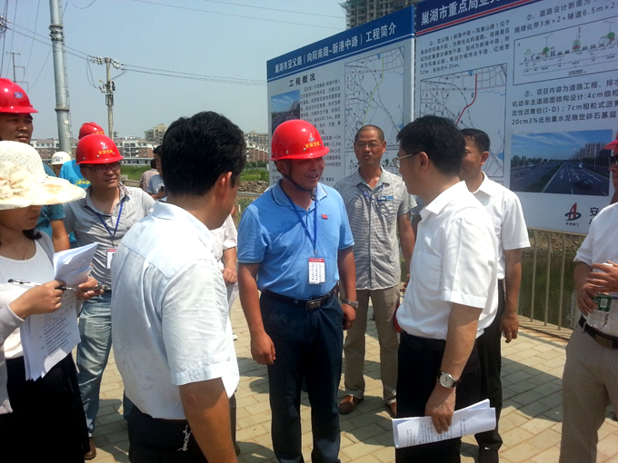 2016年7月28日上午10時,巢湖市市長張生在巢湖市重點局局長袁浩及相關(guān)人員陪同下,蒞臨安徽交航承建的亞父路工程施工現(xiàn)場,視察指導(dǎo)工作。