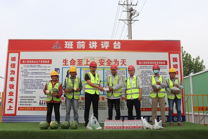 亳州PPP項(xiàng)目部始終堅(jiān)持以人為本的管理理念,關(guān)心重視職工的身體健康和安全生產(chǎn)。在發(fā)放現(xiàn)場(chǎng),項(xiàng)目領(lǐng)導(dǎo)班子首先向一線施工人員表達(dá)了“五一”節(jié)日的問(wèn)候,隨后向大家宣傳了防暑降溫常識(shí),囑咐他們?cè)诟邷叵伦鳂I(yè)時(shí)一定要做好防暑降溫措施,增強(qiáng)自我防暑意識(shí),保障各項(xiàng)工作安全有序進(jìn)行。